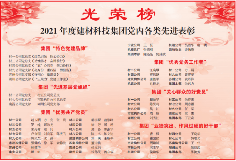 7月4日,上海建工建材科技集團召開黨內先進表彰會暨黨建品牌發(fā)布會。湖州公司榮獲2021年度上海建工建材科技集團“先進基層黨組織”,姚紹武同志榮獲上海建工建材科技集團“業(yè)績突出、作風過硬的好干部”,錢偉民同志、曾啟瑞同志榮獲上海建工建材科技集團“優(yōu)秀共產黨員”,劉秀紅同志榮獲上海建工建材科技集團“關心群眾的好黨員”。